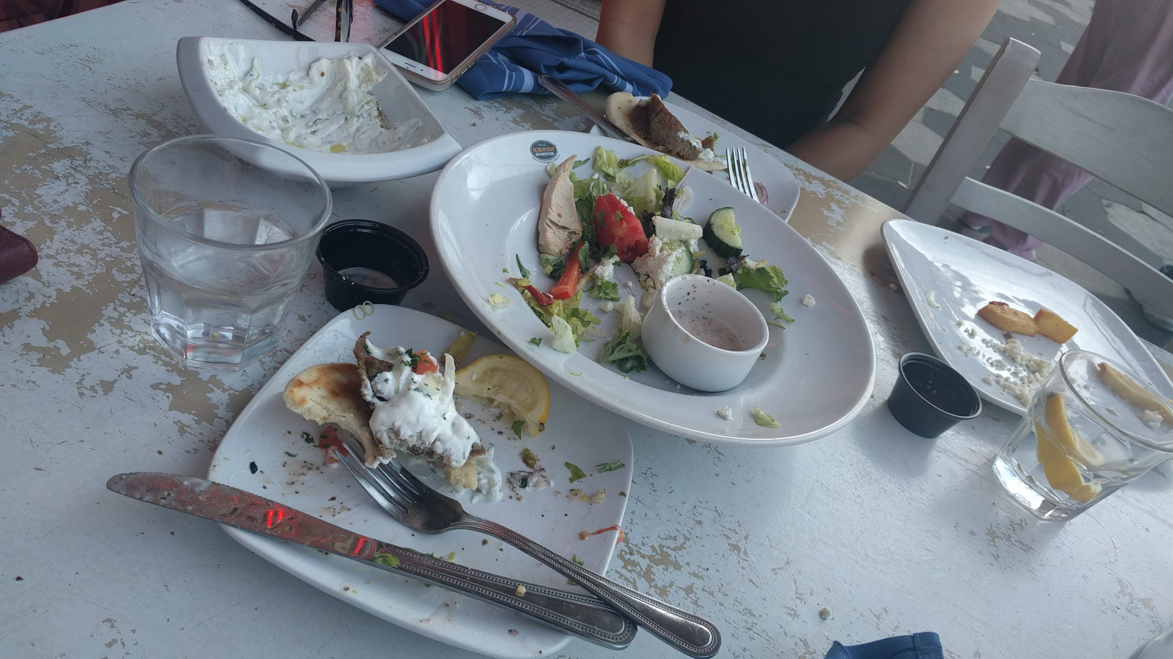 We started off with warm pita chips and tzatziki sauce as an appetizer, then dove into the Karpathos Chicken Salad. Lastly, we rounded up the experience with a Gyro Platter with tender slices of lamb and beef while stretching the rest of our tzatziki sauce.